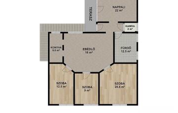 Földszint: 3 szoba, konyha, fürdőszoba + mellékhelyiség, kamra, zárt terasz, műhely.