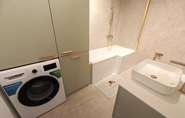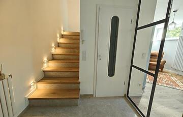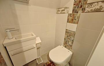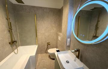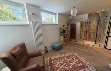 Az ingatlan fűtéséről egy Bosch kondenzációs kazán gondoskodik, a felső szinten padlófűtéssel, az alsó szinten pedig radiátoros fűtéssel. Szintén bekerült egy ultrahangos vízlágyító is. Mindkét szinten prémium minőségű burkolatok és szaniterek kerültek kiválasztásra és le-, illetve behelyezésre.