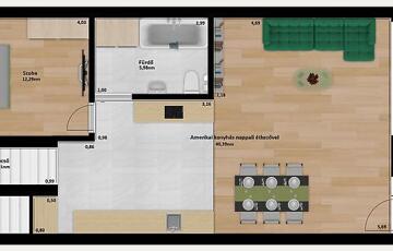 A felső szinten egy amerikai konyhás nappali, hatalmas faltól-falig érő ablakokkal, egy hálószoba és egy fürdőszoba került kialakításra. A nappaliból nyílik a 6nm-es erkély, mely üvegkorlátot kapott. Minden bútor, beleértve a gépesített konyhabútort is, egyedi tervek alapján készültek, kifejezetten ide.