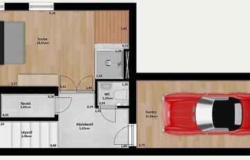 Az alsó szinten egy egyedi szoba kapott helyet. Egyediségét a beépített zuhanykabin és az infraszauna adja. Ezenkívül egy külön wc, egy tároló és a garázs. A garázs parkettázott és szekcionált motoros kapuval ellátott, melynek vételára +15M Ft, kötelezően megvásárolandó.