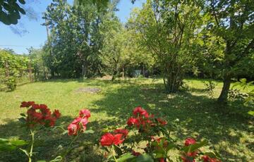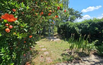 A gondosan kialakított udvart gyümölcsfák, rózsák és nagy árnyékot adó fák díszítik, intim, nyugodt hangulatot teremtve.