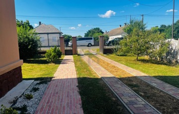 A 2242 m2-es telken új facsemeték, térkövezett kocsibeálló, körbekerített udvar, valamint egy 5x3 m-es kutyakennel található.