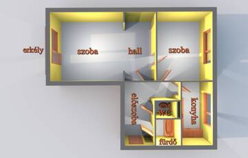 Az 55 m2 elrendezése: előszoba , fürdőszoba káddal, külön WC, konyha, két külön bejáratú szoba + hall.