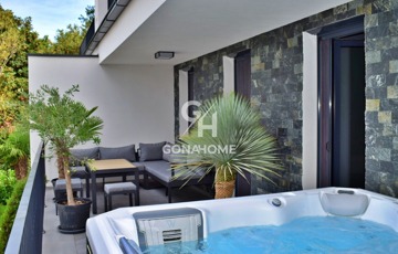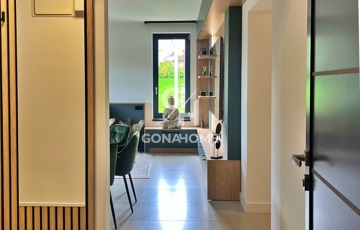 ELADÓ 1. EMELETI, 3 SZOBÁS, DUPLA ERKÉLYES ÚJ ÉPÍTÉSŰ LAKÁS, NEMESVÁMOS ELSŐ MODERN 6 LAKÁSOS TÁRSASHÁZÁBAN, bútorozva, gépesítve, AJÁNDÉK JAKUZZIVAL