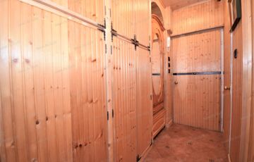 Az előszobában az egyik oldalt teljesen beépített, fa frontos ajtókkal, ami mindent elnyel. Bejárati ajtó szintén megkapta a harmonizáló fa burkolatot belülről.