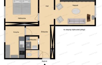 Elosztását tekintve: nappali hall, hálószoba, konyha, zuhanyzós fürdőszoba, külön WC.