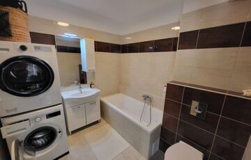 Tágas fürdőszoba nagy káddal, új mosógéppel