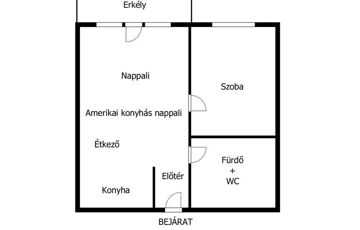 Elosztása: előtér, nappali–konyha–étkező, hálószoba, fürdőszoba–WC