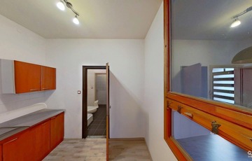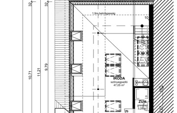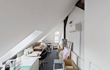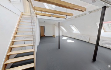 Az előtérből a lépcsőn felfelé indulva találjuk a fenti, nagyobb lakrészt, ahova belépve egy hatalmas, egy légterű, jelenleg irodaként működő helyiségben találjuk magunkat. Ebben a légtérben a tetőtérbe vezető lépcső alatt lett kialakítva egy praktikus kis konyharész. Ebből a légtérből nyílik a fürdő/wc is. Egy szépen kivitelezett fa lépcsőn tudunk a tetőtérbe feljutni, mely akár egy elszeparált külön egység (iroda, háló) is lehet. Ez a felső lakrész is lehetőséget kínál egy önálló lakás kialakítására, a nagy légterű irodarészt akár több szobává is át lehet alakítani.