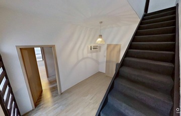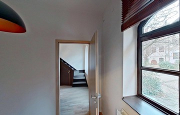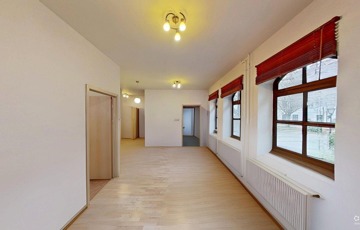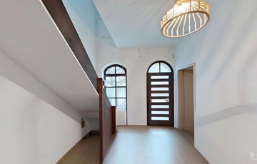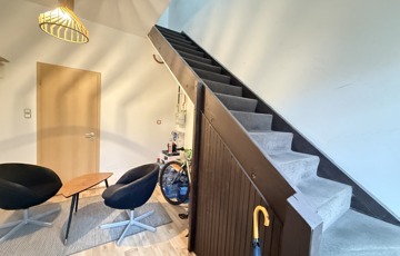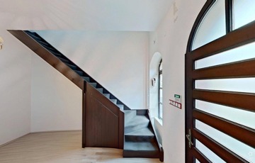 Az ingatlan főbejáratán egy tágas előtérben találjuk magunkat (ez akár váróként is hasznosítható, ha arra szükség lenne). Innen nyílik a földszinti lakrész, valamint egy lépcsőn innen lehet felmenni a felső lakrészbe.