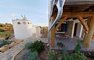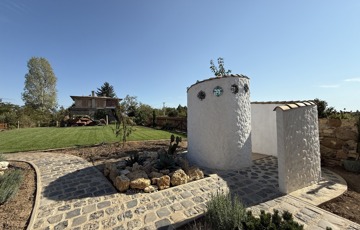 A főépülettől jobbra egy Ytong falazatú, tihanyi kővel burkolt melléképület (25 m2) helyezkedik el, szintén hódfarkú cserépfedéssel, valamint egy olasz mediterrán cserépfedéssel burkolt kerti zuhanyzó, Midea fűtőszálas vízmelegítővel. A tereket 300 m2-en travertin mészkő lépcső és bazalt macskaköves út köti össze.