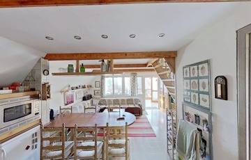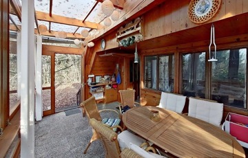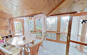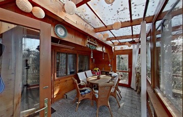 A kibővített egykori ház egy nagyon hangulatos, csupa üveg, zárt teraszt kapott, ami méltán a család kedvenc helye. Innen belépve a házba egy nyaralóhoz képest meglehetősen tágas, egy légterű, amerikai konyhás nappali fogad minket, és innen nyílik a fürdő is.