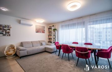 A hatalmas nappali az étkezővel és a konyhával igazi társasági központ. Főleg, hogy terasz is innen érhető el, ahonnan a parkosított, csendes belső udvarra van kilátás. Az ablakok szinte minden égtáj felé néznek, ezért a lakás napközben fürdik a fényben. A 3 hálószoba mindegyike tágas. A zuhanyzóval ellátott fürdőszobán kívül még egy külön WC-t is van, önálló mosdóval.