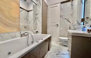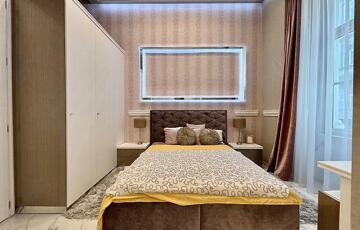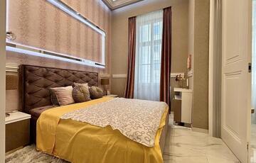A felújítás során az eredeti polgári karakter megőrzése elsődleges szempont volt: a monumentális kétszárnyú ajtók, a klasszikus arányok és a nagypolgári belmagasság elegáns alapot adnak a modern, luxus szintű kialakításnak. A lakás két külön hálószobával rendelkezik, mindkettő saját fürdőszobával, a tágas nappali pedig beépített házimozi rendszerrel lett felszerelve, amely exkluzív otthoni élményt biztosít.