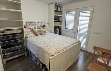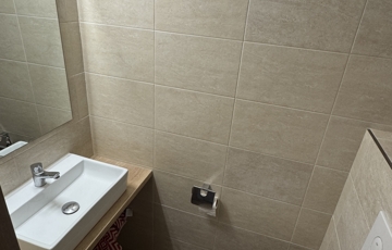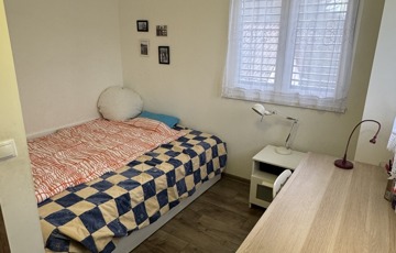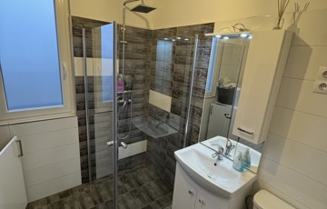 -az emeleten (77nm): három hálószoba egy fürdő-WC (itt még burkolás szükséges) és egy külön Wc került kialakításra. Ezen kívül egy gardróbon keresztül egy 26 nm-es vendégszoba található, mely külön lakrészként is használható.