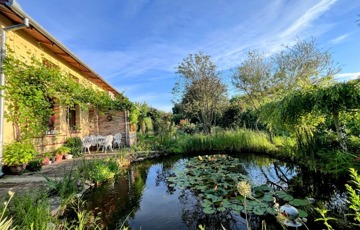 A környezetet egy rózsával körbefuttatott lugas, padok, pihenőhelyek teszik mesebelivé. Közvetlenül a ház mellett került kialakításra egy kerti tó díszhalakkal és tavi növényekkel, fedett és nyitott terasz, konyhakert, valamint a ház mögött kapott helyett egy fedett tároló és tűzifatároló.