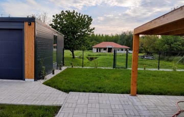 A ház 1780 m2-es részben térkövezett, parkosított telken fekszik, kétoldalt betonkerítéssel, hátul 3D-s fém kerítéssel határolt. Továbbá helyet kapott a telken egy 30 m²-es garázs is, mely elektromosan nyitható.