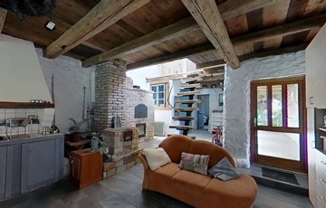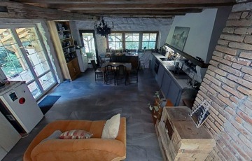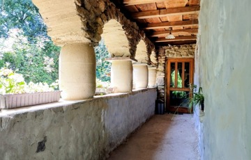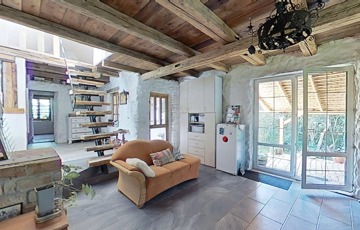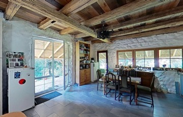 Alapozása betonalap, falai 55 cm-es kőfalak, dupla hőszigetelt fa nyílászárókkal, természetre tekintő nagy üvegfelületekkel a földszinten, ahol egy tágas, amerikai konyhás nappali-étkező, fürdőszoba és hálószoba került kialakításra. Két bejárata van a háznak, az utca felől egy 12,5 m2-es tornácos, fedett terasz, a patak felől egy félig fedett 30 m2-es hátsó terasz került kialakításra.
