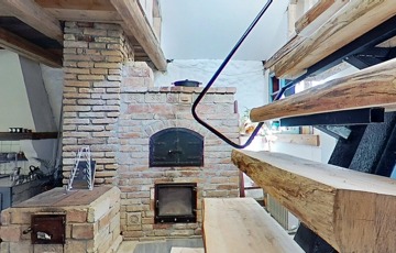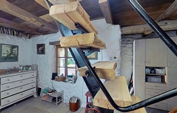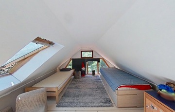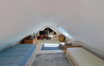 A tetőtér további egy 32,5 m2-es hálószobát foglal magába, mely egy légtér jelenleg, de igény szerint ketté osztható. A szinteket egyedi kézműves rönkfa lépcső köti össze.