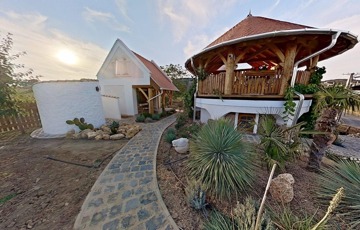 A főépülettől jobbra egy Ytong falazatú, tihanyi kővel burkolt melléképület (25 m2) helyezkedik el, szintén hódfarkú cserépfedéssel, valamint egy olasz mediterrán cserépfedéssel burkolt kerti zuhanyzó, Midea fűtőszálas vízmelegítővel. A tereket 300 m2-en travertin mészkő lépcső és bazalt macskaköves út köti össze.