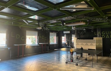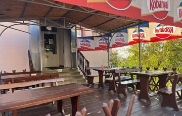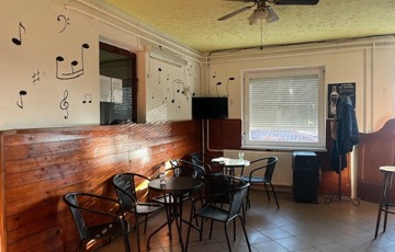 Itt egy nagy terem, a söröző pulttal és asztalokkal kisebb helyiségben, konyha, közlekedő, le- és feljáró, 2 vizesblokk (női- férfi WC), valamint a főbejárat van, előtte 6 asztalos terasszal.