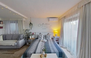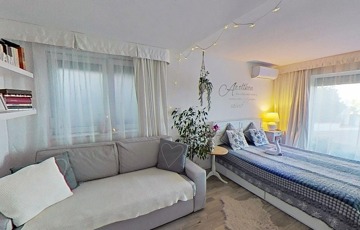 A D-i tájolású épület kétszintes, két különbejáratú, közel azonos méretű klimatizált apartmannal rendelkezik, belső hasznos területe összesen 70 m2. A szinteket egy külső lépcső kapcsolja össze. Az alsó szinten hálótér kádas fürdőkáddal és illemhelyiség került kialakításra. Az emeleten fürdőszoba, étkező-konyha, az ezeket összekapcsoló előtér, valamint hálószoba kapott helyet pazar panorámával a Balatonra. A ház alaprajzáról, a szobák méreteiről, elosztásáról a virtuális bemutató keretein belül tájékozódhat. Megtekintés előtt érdemes bejárni!