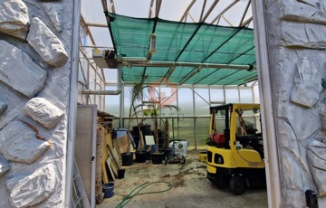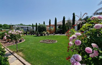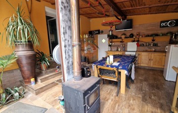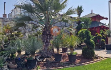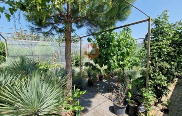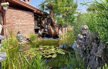 és benne egy 100 m²-es üvegház extra belmagassággal, kétfajta fűtéssel, japán pagodával.