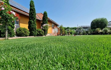 Mediterrán kert: olajfák, pálmák, gyönyörű gyepszőnyeg