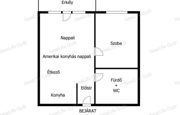 Elosztása: előtér, nappali–konyha–étkező, hálószoba, fürdőszoba–WC