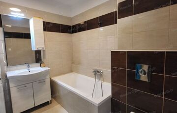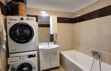 Tágas fürdőszoba nagy káddal, új mosógéppel