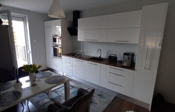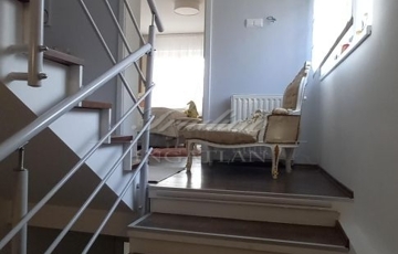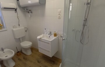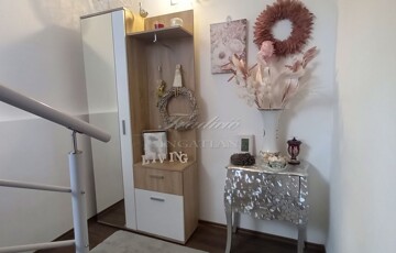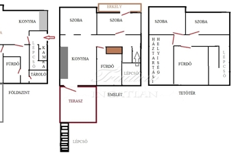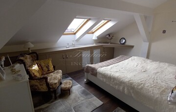 Az emeleti szint a hátsó terasz irányából is megközelíthető, itt egy étkezős konyha (még nem használt, vadonatúj konyha, felső kategóriás gépekkel) , egy fürdőszoba, valamint 2 szoba található, amelyből az egyik szoba nappaliként a másik pedig egy saját erkéllyel rendelkező hálószobaként funkcionál. A tetőtérben további két kellemes méretű hálószoba, a háztartási helyiség és a harmadik fürdőszoba található.