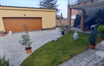 A szépen karbantartott, parkosított, térkövezet telken a családi ház mellet egy dupla garázs és egy tároló is helyet kapott. A nagyméretű bejárati kapu és a szankcionált garázskapu is motorral van szerleve. A garázs mögött parkosított, fűvel beültettet rész található.