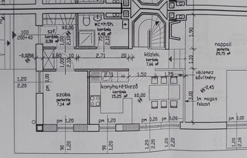 A helyiségek elrendezése és pontos méretei az alaprajzon jól láthatók. A földszinti 7,14 m2-es, jelenlegi háztartási helyiség akár 5. szobaként is funkcionálhat.