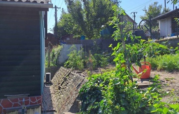 A kert fűvel, veteményessel van beültetve és egy tároló is helyet kapott.