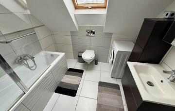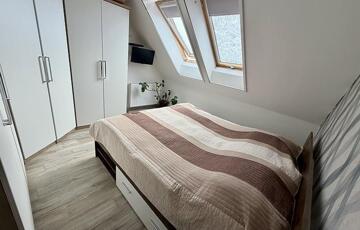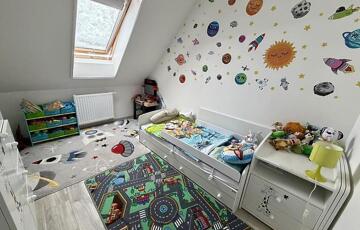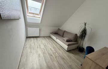 Az emeleti szinten három külön nyíló szoba, egy WC-vel ellátott fürdőszoba, valamint egy padlástér található, amely kiválóan alkalmas tárolásra. A lakás műanyag nyílászárókkal rendelkezik, minden ablak redőnnyel és szúnyoghálóval felszerelt, a fűtést kondenzációs gázkazán biztosítja, emellett padlófűtés és két darab hűtő-fűtő klíma gondoskodik a komfortérzetről mindkét szinten. Az épület kiváló hang- és hőszigeteléssel rendelkezik (Silka falazat, 12 cm szigetelés), a lakáshoz pedig saját parkolóhely is tartozik. A vételár részét képezik a szülői hálószobába egyedileg tervezett gardróbszekrény, valamint a teljes gépesítéssel ellátott konyhabútor és a fürdőszobabútorok is.