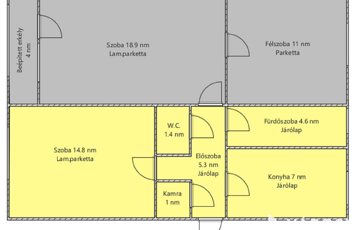 Helyiségei: 2 szoba, 1 szoba, konyha, kamra, előszoba, fürdőszoba, külön nyíló W.C., beépített erkély.
