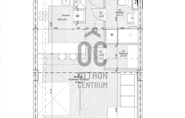 Ez az 1. emeleti lakás 43,47 nm-es, nappali-étkező-konyhás, 2,22 nm-es loggiával.