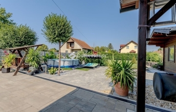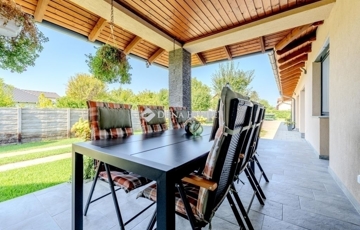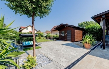 A házat körülölelő kert igényesen parkosított, rendezett, intim, ideális pihenésre, családi és baráti összejövetelekre.
