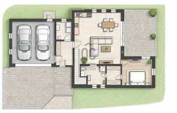 - Földszint: előtér, amerikai konyhás nappali étkezővel, hálószoba, gardrób, fürdőszoba, háztartási helyiség, garázs, terasz.