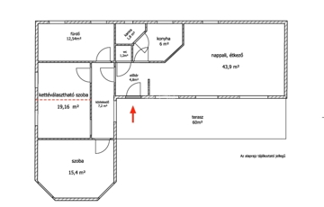 Felosztása: amerikai konyhás nappali, 2 hálószoba, előtér, nagy méretű fürdőszoba mosdóval, különálló mosdó, spájz.