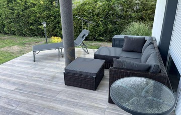 A nappali és a konyha is közvetlenül kapcsolódik a hátsó, fedett 40 négyzetméteres teraszhoz, amely a családi vacsorák és baráti összejövetelek ideális helyszíne.