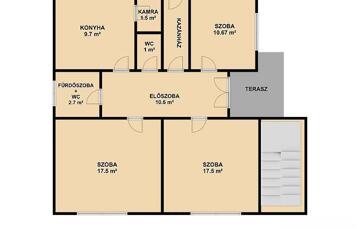 Emelet: 2 szoba, nappali, étkezős konyha, kádas fürdőszoba, mellékhelyiség.