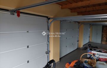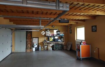 Utcafronton 3 állásos, elektromos Hörmann kapukkal felszerelt garázs épült, pakolható tágas tetőtérrel. A garázs alatt hűtőkamra, fatároló és műhely került kialakításra.