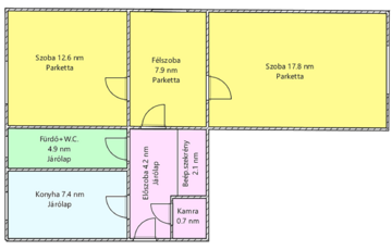 Helyiségei: 2 szoba, 1 félszoba, étkező, konyha, kamra, előszoba, fürdőszoba.