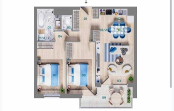- Elrendezés: előszoba, konyha, nappali–étkező, közlekedő, WC, fürdőszoba, 2 hálószoba, erkély