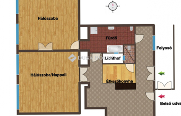 A lakásba lépve tágas konyha és étkező fogad, ahonnan egy hangulatos, növényekkel teli belső udvarra is kiléphetünk.