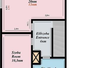 Az alsó szinten egy világos szoba, konyha, étkező, külön WC és tároló található, praktikus és jól élhető elrendezéssel. Az emeleti szinten két kényelmes hálószoba és egy fürdőszoba kapott helyet, biztosítva a privát életteret a család számára.