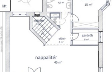 • nagyterű NAPPALI (kb. 45nm), plusz az alsószinti terasz fölé nyúló kertre néző TERASZ (kb. 7nm),