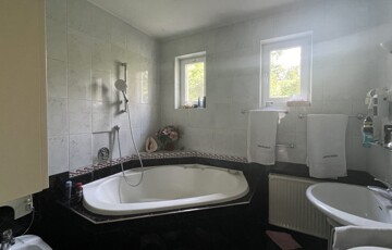 • tágas ablakos sarokkádas bidet-vel is felszerelt tágas fürdőszoba (kb. 6,5nm),