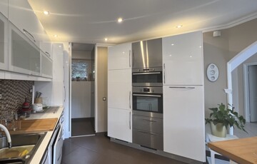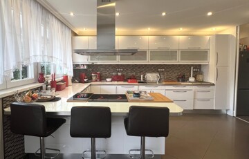 • spacious Kitchen (15 sqm) – connected to the dining area, overlooking the garden terrace through large glass surfaces, equipped with built-in kitchen furniture and appliances, including a kitchen island with a high-performance extractor hood and dining counter.